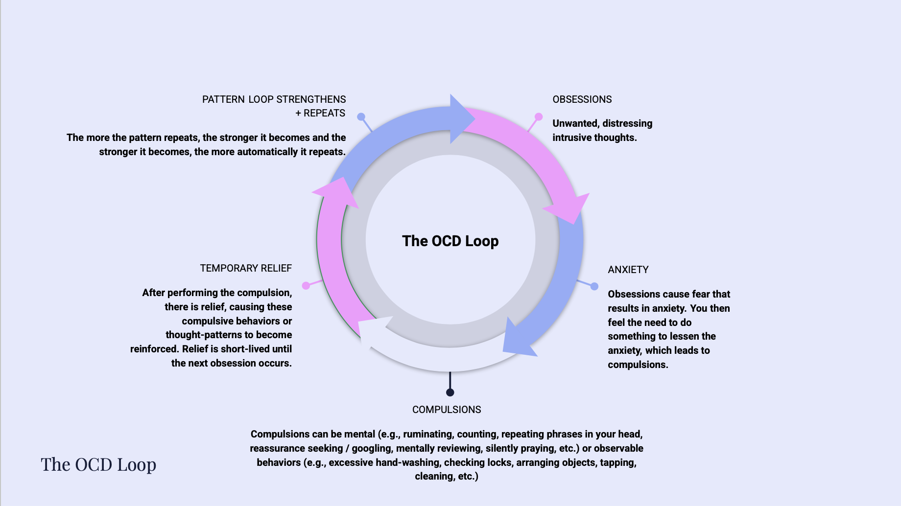 A distressing intrusive thought arrives → fear spikes → you perform a compulsion (e.g., check, google, seek reassurance, ruminate, avoid, etc.) → fear temporarily reduces and you feel relief → then, minutes or hours later, the intrusive thought returns louder and stronger than before (or a new, even scarier thought emerges in its place) → the cycle repeats